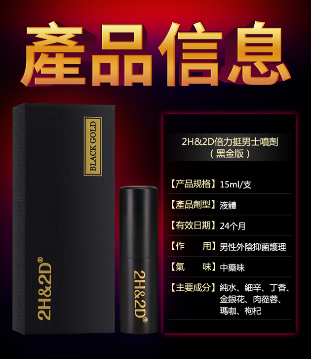 由於是二代純天然草本成分,2H2D持久液黑金版比起之前的款式,更容易被人體吸收,只需輕輕一噴,便可靜候兄弟的挺立。2H2D持久液黑金版能夠刺激海綿體,加速血液循環,從而起到延長勃起時間的作用。