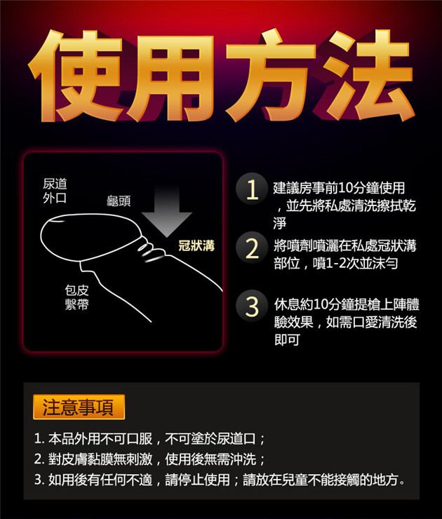 由於本品效果強烈,請大家可以多試幾次,根據自身情況找到壹個這合自己的次數,我不用時間壹般15分鍾左右,第壹次用噴了4下,結果做了1個多小時沒射,後來體力不支疲軟了,汗。