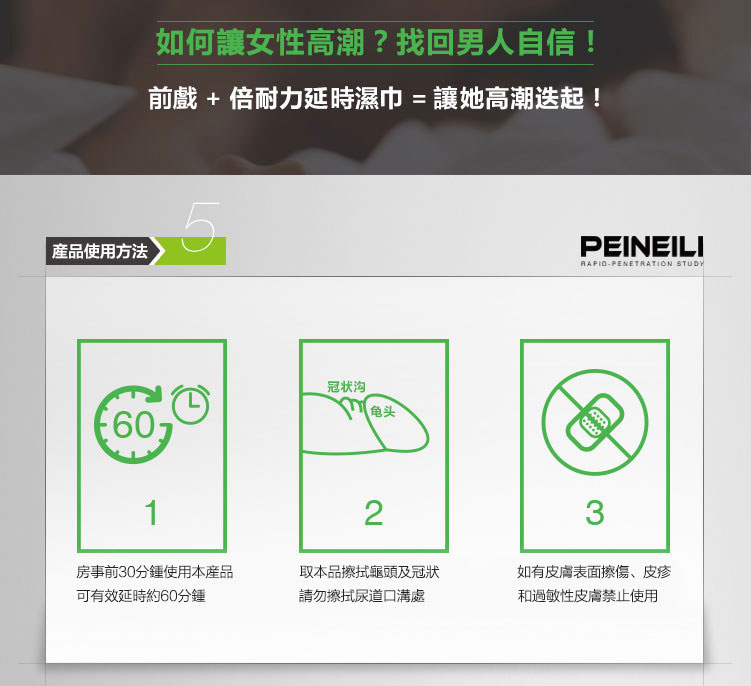 用法用量:房事前使用本品塗抹鬼頭和冠狀溝部位,均勻塗抹即可,本品有效時間約60分鐘。