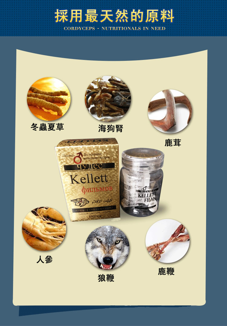 主要成分:海狗腎、還馬鞭、鹿茸、鹿鞭、狼鞭、冬蟲夏草、人參、鎖陽、雪蓮、紅景天、枸杞子等。