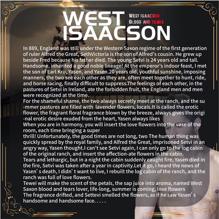 公元889年英格蘭還處於第一代統治者阿爾弗雷德大帝的西薩克森政權之下,賽特維是阿爾弗雷德堂兄之子,因父親戰死,一直在弗雷德身邊長大,年輕的賽特維24歲,高大英俊,繼承了良好的貴族血統!在皇室內宴上,偶遇了伯爵克魯的兒子亞森,亞森時年20歲,青春陽光,氣宇軒昂,兩人一見如故,經常相約一起狩獵,騎射,跑馬,終於難以抑制彼此的感情,在賽特維位於愛爾蘭的牧場,偷食了禁果,當時的英格蘭男男相交被認為奇恥大辱,兩人總是偷偷相約在牧場偷會,夏季的牧場開滿了淡紫色的小花,當地人稱可情花,微風吹來的可情花香,總是給人一種從內心散發出的原始愛欲,亞森總是喜歡在交合時將可情花插在房間花瓶內,每次都能帶來超強的快感!可惜好 景不長,兩人的事情很快被皇室知曉傳開,阿爾弗雷德大帝,一氣之下將賽特維囚禁起來,亞森想盡辦法卻再也見不到賽特維,只能經常去原來牧場的小木屋,在小木屋裡插上可情花,流淚昏睡,卻在一天夜裡小木屋突然失火,亞森在火災中死去,賽特維在囚禁-年後 被放出來,得知亞森去世的消息,痛不欲生,重建了牧場的小木屋,牧場種滿了可情花,,賽特維將可情花瓣,莖汁做成香薰, 取名西薩克森血淚愛人,終生未娶,夏天來了,可情花香飄過,賽特維聞著花香,彷彿又看到了亞森英俊帥氣的面容.....